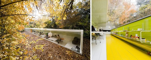 Većina nas radi u neinspirativnim kancelarijskim prostorima koji izgleda da su projektovani bez veze sa prirodom i bez sluha za nju. Možemo samo da sanjarimo o pogledu na vrhove drveća koje imaju srećnici koji provode svoje dane u madridskom poslovnom prostoru španskog arhitektonskog biroa Selgas Cano. Kancelarija u obliku cevi je porinuta u tlo, a nudi jedan dugački zid od prozora, dajući prisutnima osećaj da su potpuno stopljeni sa šumom.