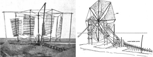 Kineska vetrenjača sa horizontanom osovinom Još uvek u upotrebi u nekim delovima Kine (desno)