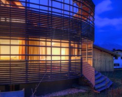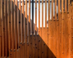 Dodatni pravougaoni čelični ram i staklena ispuna daju horizontalnu vezu, dok spoljašnji omotač od drvenih daščica pruža kako zaštitu kuće od vremenskih nepogoda, tako i privlači poglede istovremeno obezbeđujući intimnost unutrašnjeg prostora.