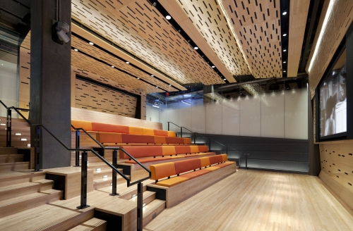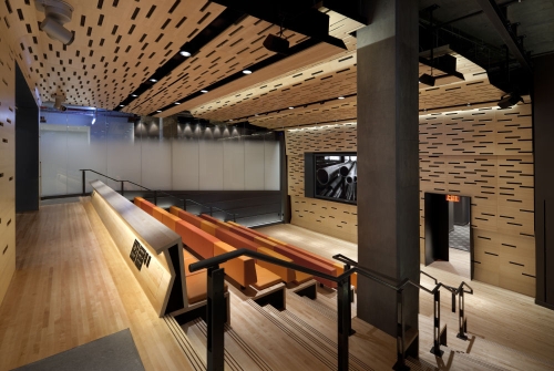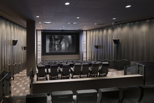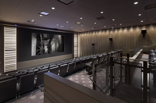 Ukopan u zemlji, amfiteatar ima stepenasto sedenje u nijansama narandžaste i žute sa završnom obradom od javorovih panela sa vertikalnim prorezima koji obezbeđuju klimatizaciju i zvučnu absorciju. Prostor je dramatično izbušen sa 5m širokim garažnim vratima. Sa obe strane amfiteatra nalaze se dve male sale (jedna sa 90 a druga sa 150 mesta). Iako su udobne i prostrane, ove sale se čine malim imajući na umu činjenicu da aspiraciju centra da postane najbolje mesto za gledanje filmova, ali veličina sala, kao i niske visine plafona su diktirani postojećom konstrukcijom.