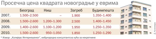 Ako su se izvođači odrekli dela kolača, a kako kaže Milovanović, cena građevinskih radova se godinama drastično ne menja i iznosi oko 500€/m2, investitori bi trebalo da se, barem privremeno, pomire sa činjenicom da ne mogu, kao pre četiri godine, da računaju na više od 50% zarade. Prema računici Milovanovića, na cenu radova potrebno je još 800€ da bi se kvadrat sazidao. U to ulaze troškovi pribavljanja zemljišta, projektovanje, komunalni priključci, cena kapitala, naknada za uređivanje gradskog građevinskog zemljišta. Tako se dolazi do 1.300€ za izgrađeni kvadrat u Beogradu.