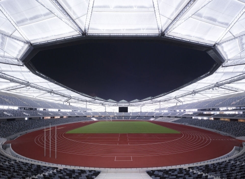 Krov napravljen od membrana je pridržan spoljašnjim ramom i njegova primarna funkcija jeste da pokrije gledalište. Sa prečnikom od 230m i prepuštanjem od 54m ka unutrašnjosti stadiona, krov se nosi preko 36 pari kablova do čijih zatezanja se došlo preko duplih kružnih prstenova. Stadion je projektovan tako da može da primi 40.000 gledalaca.