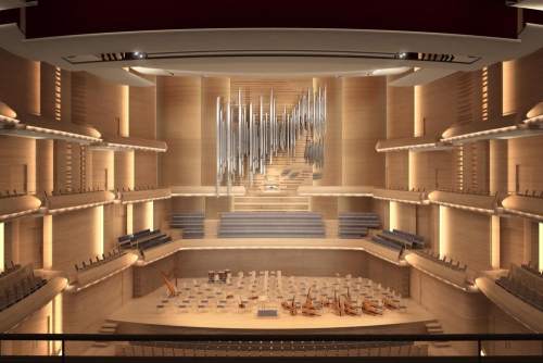 U pogledu projekta same koncertne dvorane, koja prima 1.900 ljudi, arhitekta Dajmond je rekao: "Njen DNK je onaj od tipične kutije za cipele sa savremenim karakteristikama." "Način na koji se razlikuje od sličnih objekat jeste što mi imamo visoke, srednje i niske raspone zvuka koje smo dobili oblikovanjem zidova u seriji kaskada koje podsećaju na školjku... u sredini se nalazi presek koji se pruža horizontalno... kao i u postizanju i pojačavanju visokih frekvencija upotrebom horizontalnih drvenih panela, koji variraju u teksturi od onih oblika šmirgle pa sve do veoma glatkih.