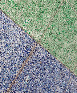 Cebuski kaže da je njegov omiljeni cementni materijal za zamenu kad su u pitanju ploče – Bottle-Pozz, proizvod preduzeća Fishstone koji je on testirao oko tri godine. Taj proizvod se na američkom tržištu nalazi oko godinu dana. Visokokvalitetni pocolan napravljen od korišćenih staklenih boca, Bottle-Pozz je smrvljeno staklo sterilizovano u rotacionim pećima koji sagoreva zagađivače kao što su šećer i papir. Čisti komadi se onda puštaju kroz završni mlin koji proizvodi beličasti stakleni prah sa česticama sličnim po veličini česticama portland cementa. Tako ovo samleveno staklo zamenjuje alkalni materijal, a povrh toga, njegove čestice su dovoljno male da ih preostali alkali u potpunosti transformiše, stvarajući kalcijum-silikat. "Deluje čudno, ali kako staklo postaje finije i finije, ono prestaje da uzrokuje reakciju alkalnih silikata", kaže Celebuski. "Ako je čestica dovoljno mala, kalcijum-hidroksid je troši i ništa ne ostaje što bi izazvalo reakciju alkalnih silikata." Stakleni prah, koji se preporučuje za projekte gde se želi koristiti beli cement, takođe sprečava rascvetavanje i čini beton jačim.