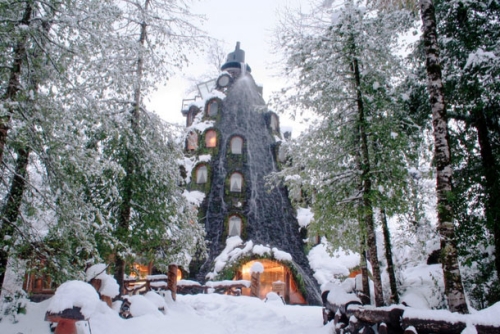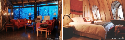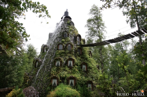 Hotel se nalazi u privatnom prirodnom rezervatu Huilo-Huilo u severnom Čileu u regiji Patagonija i predstavlja omaž bogatom prirodnom nasleđu koji je pod zaštitom države. I zamislite ovo - posetioci i gosti hotela ulaze u objekat preko visećeg mosta, gde ih pozdravlja kaskadni vodopad koji izvire na vrhu zelenog krova oblikovanog u obliku kupe.
