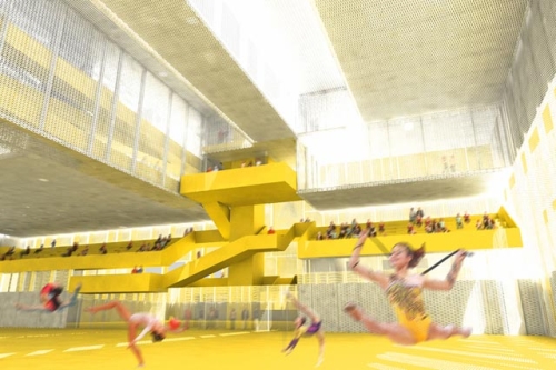 Objekat Nacionalnog gimnastičarskog centra je projektovan kao kompaktna celina koja smešta dve velike hale, od kojih je jedna od njih znatno niža od druge, smeštenih jedna pored druge. Ostatak navedenih programa smešten je duž istočne strane koja se graniči sa parkom, i u prostoru iznad niže hale. Perimetarski zidovi su projektovani od lagane čelične konstrukcije koja dozvoljava prolaz dovoljno svetlosti. Zidovi programskih funkcija koji su smešteni iznad hala su sličnog dizajna.
