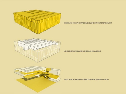 Predloženi prostorni projekat sa svojim predodređenim, kompaktnim, volumenima sportskih hala deli pojas na tri, jasno definisane, zone namenjene halama, koje su odvojene jedna od druge parking prostorima. Saobraćaj je organizovan od Koprska ulice na zapadu (što je bilo, donekle, protivno urbanističkim zahtevima), dok je pešački pristup jasno odvojen i organizovan sa strane parka na istoku. Odmah pored objekata smešten je park koji nudi veliku centralnu stazu koja povezuje sve hale.