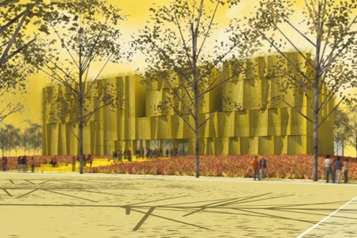 Raspored eksterijera je projektovan kao nastavak nedvosmislenog izraza objekta. Platforma ispred objekta obojena jarkim bojama predstavlja direktan nastavak razgranate komunikacije unutrašnjosti i funkcije sa celim trgom koji povezuje objekat sa parkom. Ostatak placa oko objekta je zasađen četinarima i adekvatnim rastinjem čiji izgled se menja tokom godine.