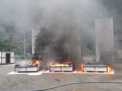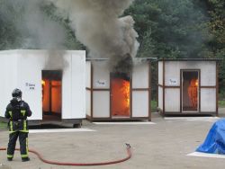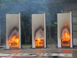Testovi sprovedeni na CNPP-u sastojali su se od izlaganja vatri različitih prefabrikata površine 3m2 sastavljenih od panela pokrivenih izolacijom ili od sendvič panela. Ponašanje tokom 20 minuta testa veoma se razlikovalo: prefabrikati sa PIR-om odolevali su kraće, uz fenomen flash over (plameni udar ventilisanog prostora) nakon nekoliko minuta, dok se model koji sadrži kamenu vunu dobro opirao.