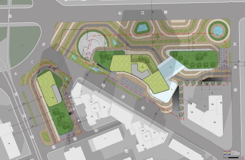 Arhitekte su istraživale istoriju Mizhu trga i pronašli su da je on jedini trg u Dalijanu kroz koga je prolazio tramvaj. Zbog toga je u prizemnom nivou, gde se nalaze prodavnice, uvedena nova tramvajska linija koja prolazi kroz komercijalni trg. Pored toga, u okviru uređenja trga postavljeno je dosta različitih šablona kretanja koji doprinose "iluziji" dinamičkog pokreta u okviru trga.