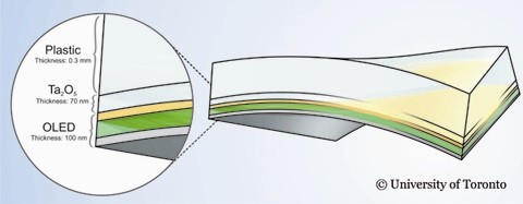 Tim sa Toronto univerziteta upario je fleksibilnu plastičnu podlogu sa 50 do 100 nanometara debelim slojem tantalovim oksidom - materijal za oblogu optike - pre nego što su postavili film organskih elemenata koji emituju svetlo. Tantalov oksid je uspeo da pojača napon elektriciteta i samim tim obezbedi jačinu svetlosti koja, generalno, nije dostupna kod plastičnih podloga OLED-a.