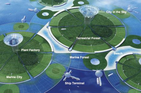 Japanska kompanija Shimizu Corporation (Šimicu Korporejšn) razvila je jedinstveni prototip koji bi omogao da ugleda svetlost dana posle 2025. godine. Nazvan Green Float, ovaj grad, čiji bi svaki modul mogao da primi do 50.000 stanovnika, razvijaće se samostalno na okeanu. Module čine osnova od 2km u prečniku i kula nazvana City in the sky (Grad na nebu).