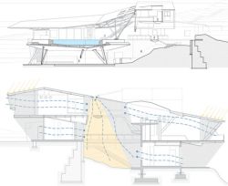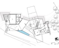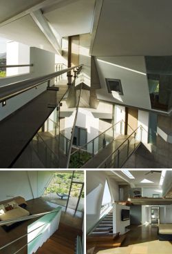 Niz spoljašnjih tremova, staza i mostova angažuju pejzaž na više nivoa, čineći kuću bitnom i za kretanje (kao što sugeriše njena apstraktna forma) koliko i za stanovanje.