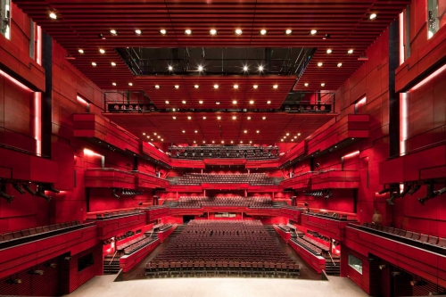 Živopisno obojena staklena vrata prekidaju smirene crne površine i daju pristup sobama za sastanke, konfernecijskim i probnim salama, kao i izložbenom delu gde posetioci mogu slobodno da lutaju. Pogodnosti na licu mesta uključuju prodavnice, restoran, vidikovac i bar, prizemni bistro i podzemni parking.