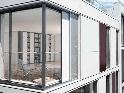 Dok kod pasivnih kuća uglavnom imamo velike prozore na južnoj fasadi, ova gradska kuća se, takođe, može pohvaliti velukodušnim otvorima i na severnoj, istočnoj i zapadnoj fasadi, zahvaljujući dinamičkom fasadnom sistemu od kompanije Schüco. Na istočnoj fasadi nalaze se veliki prozori do 2,5m x 2,9m, dok je severna strana naizmenično i u uskim i širokim otvorima. Na severu se nalaze stepeništa koja poseduju sertifikovane elemente aluminijumske fasade pasivnih kuća.
