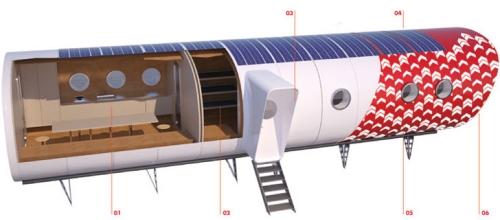 Sve - od spoljašnje ljuske do unutrašnje opreme - je modularno tako da kada dođe vreme, utočište može biti prebačeno negde drugde. Solarni paneli, koji su postavljeni na krovu, mogu da proizvedu 2,5Kwh solarne energije - što čini utočište potpuno samodovoljno - i potrebno je samo dva dana da se postavi. Ovo je zaista izuzetan uspeh u modularnom projektovanju... sada samo treba da odemo tamo!