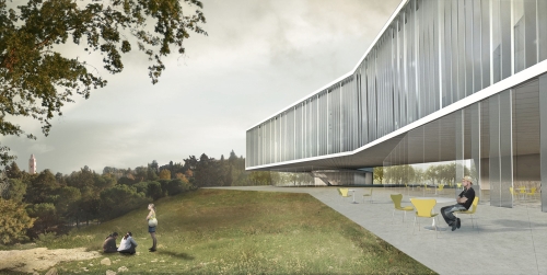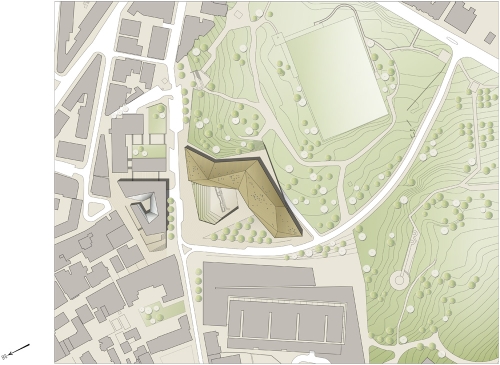 Četvoronivelisani nivo spaja plutajuće krilo sa potonulim. Deo plutajućeg krila visi iznad nivoa zemlje, stvarajuči jaz - vrata - od izgrađenog grada ka parkovskom prostoru. Pešaci koji se opuštaju na javnom trgu ili šetaju ka parku mogu na ovaj način biti namamljeni da uđu u zgradu MOTJ-a i da je iskuse.