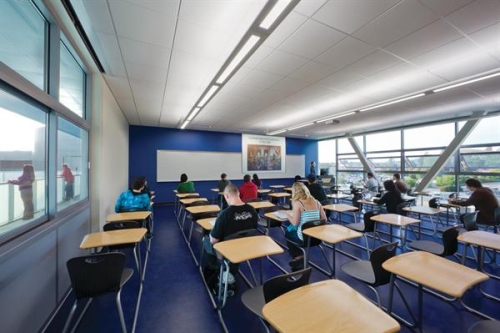 Karels je oivičio perimetar zgrade sa učionicama u jedinstvenom hodniku, i stvorijo vizuelnu i fizičku konekciju sa prirodom. Ograničene prozorima sa obe strane, mnoge učionice imaju potencijal ometanja, ali vrhunska audio-vizuelna tehnologija i jako akcentovane boje zidova pomažu nastavnom osoblju da zadrže fokus studenata. U cilju sprečavanja odsjaja, prozori su opremljeni sa vrhunskim prozorima niske emisivosti, dok je svaka učionica opremljena sa operativnim unutrašnjim zastorima.