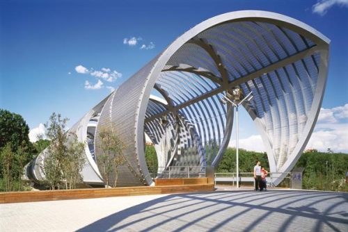 Zašiljene konusno čelične forme su pokrivene sa mrežom od nerđajućeg čelika, koja okružuje most u spiralnom dizajnu sa jednog kraja na drugi. Ovaj spiralni oblik sija na sunčevoj svetlosti i noći je transformisana u zlatnu spiralu upotrebom osvetljenja. Dva dela, koja su 150 i 128 metara dugačka, proširuju se u parku i sastaju u centru. Ovo formira ulaz u park i spaja dva dela unutrašnjeg grada.
