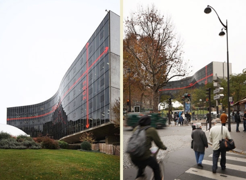 Zgrada Francuske komunističke partije u Parizu građena je sedamdesetih godina prošlog stoleća, a osim Nimajera za njen izgled, tačnije staklenu fasadu na kojoj je instalacija aplicirana, zaslužan je i francuski arhitekta Jean Prouvé.