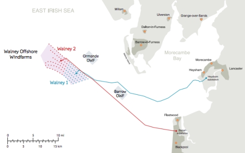 Mapa ispod pokazuje poziciju vetroparka Walney u Irskom moru. Rastojanje od turbina do obale varira između 14,4 i 25,6 kilometara - što je značajna daljina koja pomaže da se smanji vizuelni uticaj koji vetrofarma ima na obalu. Plava i crvena linija na mapi označava položaj kablova za Walney 1 i 2.