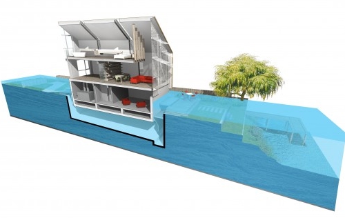 Iako će amfibijska kuća počivati na fiksnim temeljima, tokom poplavne situacije celokupna zgrada je projektovana da se izdigne van temelja i da pluta zadržavajući plovnost uz pomoć voda. Ovo je moguće zbog vlažnih dokova, koji su sastavljeni od potpornih zidova i ploče koji su smešteni ispod kuće. Kada dođe do poplave dokovi se pune vodom i kuća se iziže u skladu sa tim. U cilju sprečavanja kuće da jednostavno otplovi, četiri delfina (stalnih vertikalnih oslonca) su raspoređeni blizu bočnih zidova.