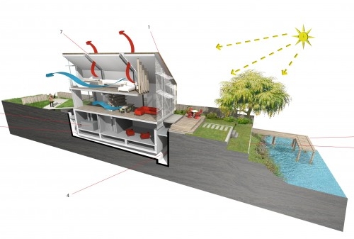 Kuća je projektovana da bude jako dobro izolovana i nisko-energetska zgrada, koja ima uređaje za uštedu vode i energije, velike prozore, kosi krov i dimnjak koji dopunjuje nepravilnu krovnu liniju susednih kuća. Zastakljena južna fasada pruža panoramske poglede ka reci i, takođe, ka dobro osmišljenom vrtu koji je lep i funkcionalan. Imajući ulogu prirodnog sistema upozorenja, vrt, sa terasama postavljenim na različitim nivoima, će se plaviti postepeno dajući stanarima dovoljno vremena da procene situaciju i da se evakuišu ukoliko je potrebno.