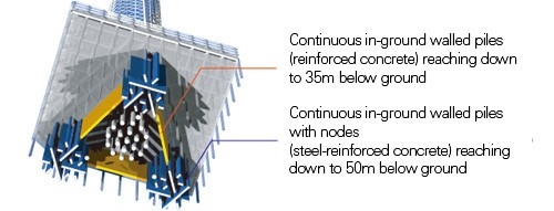 Za formiranje trougla između tri klastera zadužena su tri duža podzemna zida od po 35 metara. Korišćenje pilona u obliku zidova povećava korisno trenje sa zemljom. Drugi klaster šipova je ugrađen u centru trougla, ispod centra kule.