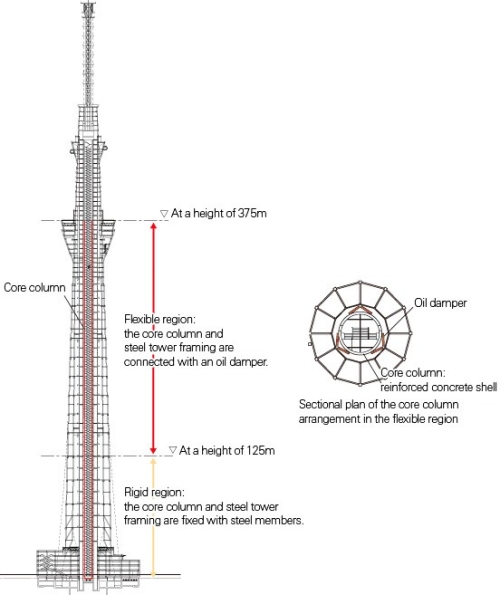 Dodatna otpornost se postiže kroz "dodati mehanizam kontrole mase" (iliti podešenog masovnog dampera) - sistem za prigušenje koji, u slučaju zemljotresa, se kreće u suprotnom pravcu od same zgrade, i zadržava centar gravitacije što je moguće centrirano u bazi kule. Iako čelične šipke, beton, ili čak i sama struktura zgrade se koristi u ovu svrhu, ali kompanija Nikkei Sekkei tvrdi da je centralni stub u ulozi dodane mase za prigušivanje vibracija prvi na svetu primer ovakve primene.