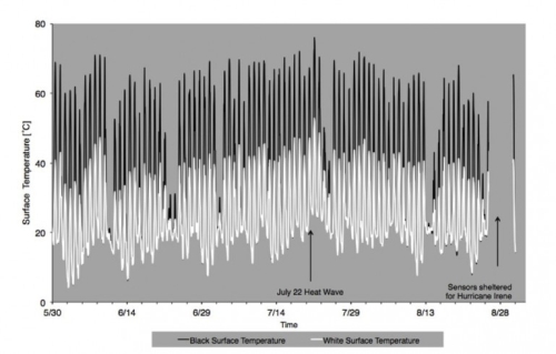 Dugo je sugerisano da beli krovovi mogu pomoći u smanjenju toplotnih ostrva mikroklima koje okružuju naše gradove jednostavno reflektujući solarnu radijaciju direktno nazad u svemir. Nova studija stavlja teoriju u praksu stavljajući tri bela materijala jedno pored drugog na tri njujorška krova. Rezultati ove studije izgledaju veoma pozitivni, jer beli krovni pokrivači smanjuju maksimalne krovne temperature u letnjem periodu "u proseku za 24 stepeni Celzijusa".