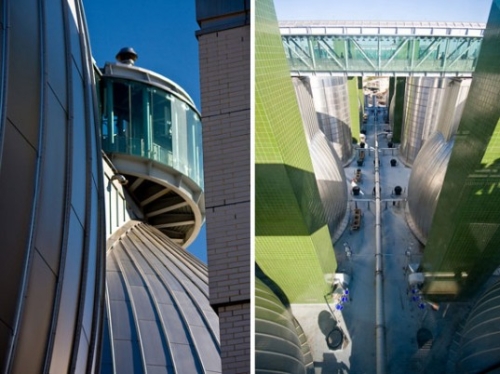 Veliki, u obliku jaja, tankovi za trulište (digestori - digesters) postrojenja, koji tretiraju preostali materijal koji je otklonjen iz otpadnih voda - takođe poznat kao mulj - su obeležje dizajna zgrade. Ali dizajn za njih nije bio očigledan, posebno prilazi i pasarele koje ih povezuju. "Znali smo da će to biti jaje", kaže Olkot. "Morali smo da shvatimo kako bi to izgledalo, prilazi i pasarele koje spajaju jaja."
