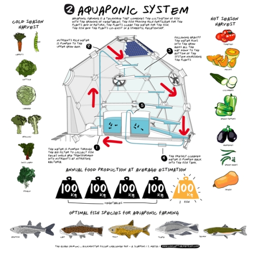 Akvaponični koncept predstavlja brak akvakulture (uzgoj vodenih životinja, poput riba ili rakova) i hidroponika (gajenje biljaka u vodi). Otpadne materije od riba (i njihove hrane) se akumuliraju u vodi. Kada se ove materije usmere ka biljkama one se konzumiraju kao nutrienti, pročišćavajući vodu u tom procesu pre nego što ona postane previše zagađena za ribe. Postoje slični koncepti, poput projekta Fishy Farm, koji primenjuje principe sličnih simbiotičkih ideja.