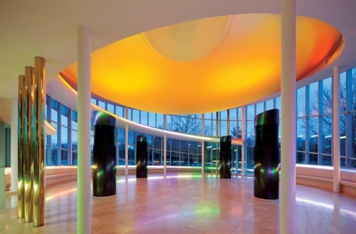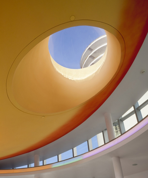 Unutra, plafonska ravan je izvrnuta kupola od gipsa, obučena u akustičnom gipsu preko zvučne izolacije, sa tri svetlarnika koji pružaju duboke okrgle praznine - kompozicija koja je inspirisana senzualno rezbarenim mermerom umetnice Barbare Hepvort (Barbara Hepworth). Plafon i okulus zidovi su obojeni narandžastom bojom i ona prosto zapali prostor kada sunce pređe iznad. Noću, obojena, hladna - katodna rasveta, skrivena iza providnih akrilnih ploča, spiralno ide nagore po obodu.