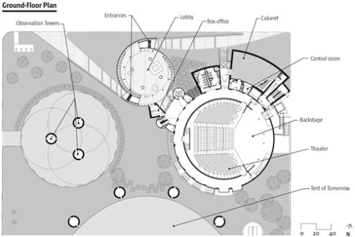 Biro Caples Jefferson projektovao je staklenu cilindričnu strukturu koja dopunjuje kružnu geometriju postojećeg pozorišta. To je providna forma koja se suptilno suprostavlja neprozirnoj formi arhitekte Džonsona. Dva volumena su spojena u ulazu u pozorište iz 1993. godine, dok se prijemni deo nalazi na osi skeletnih ostataka Šatora sutrašnjice (Tent of Tomorrow), sa pogledom na zarđale observacione tornjeve - potez koji mudro priznaje vizuelnu pretrpanost lokacije i uokviruje ga kao čudnu lepotu iz drugog doba.