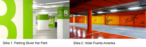 Korišćenje boja u arhitekturi kao cilj provociranja primalnih instinkta obezbeđuje korisnicima intuitivnu čitljivost o tome kako da se kreću kroz zgradu, pružajući osećaj bezbednosti i privlačnosti. Parking je odličan primer kako može da se implementira boja kao način za utvrđivanje puta u funkcionalnim prostorima koji se svakodnevno koriste.