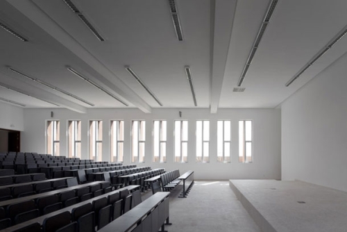 U kompleksu se nalazi krajnje jednostavno oblikovan amfiteatar, učionice, radionice, laboratorije, administracija, biblioteka, kancelarija za učitelje i osoblje. Sve prostorije oblikovane su jednakim jezikom čiste bele ljušture s uskim i malim otvorima, čija je sirovost i belina u popriličnom kontrastu s detaljima okrenutom eksterijeru u oker boji i zemljanim bojama.