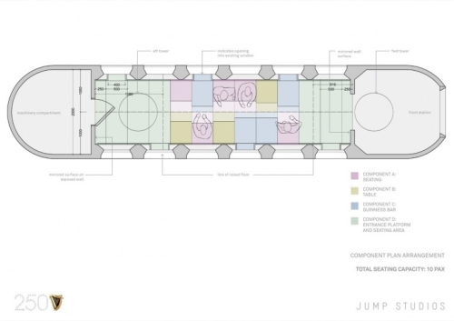 Neki od njih su izbušeni da služe kao držači za čaše dok su drugi ožičeni sa LED svetlima koji daju podmornici prikladanu atmosferu noćnog kluba. Eksterijer podmornice ima logo Guinniess 250 na strani u kome mogu da uživaju eventualno neke prolazeće podmornice.