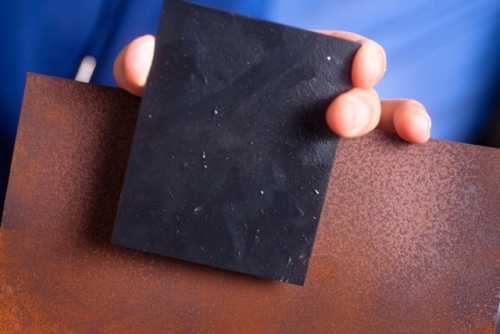 Komad čelika tretiran sa grafenskim premazom ispred netretiranog uzorka