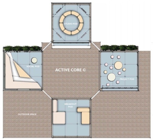 Dinamični multimodularni klasteri su izgrađeni oko centralno učeničkog centra. Aktivno jezgro može takođe da funkcioniše kao platforma za medije koju karakterišu multimedijalni ekrani koji podstiču prezentaciju školskih vesti, energetsku potrošnu, činjenice o životnoj sredini, tehnološke inovacije i rad učenika.