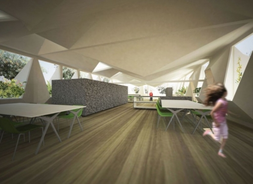 Treće mesto zauzeo je Oliver Eben (Oliver Ebben) iz biroa Studioquint iz Amsterdama, i ono je pohvaljeno zbog njegovog arhitektonskog razmatranja. "Racionalna forma učionica je napravljena prostorno i specifično prema trodimenzionalnoj origami šemi koja artikuliše formu interno i eksterno", rekao je žiri. "Spolja, odnosi reaguju na orijentaciju, perspektivu i kontekst, dok interno oni postaju trodimenzionalni. Krov sadrži lokalni kontekstualni predeo, kao deo prenosne forme."