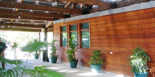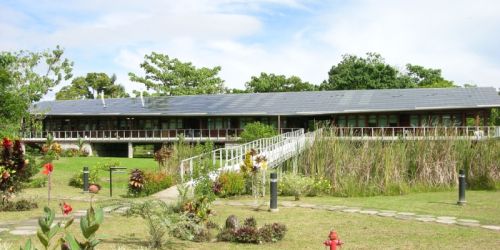 Podizanje cele zgrade na betonskim stubovima pomaže se da uhvati povetarac koji bi se koristio za pasivno hlađenje, a takođe pruža zaštitu od poplava. Klima se uvodi tako da pojedinačne sobe imaju odvojeno hlađenje. Materijali su izabrani iz ekoloških razloga, i, gde je to moguće, ostali su nedovršeni. Posečeno lokalno drvo je iskorišćeno za gornje strukture zgrade. Sistem kišnice usmerava svu kišnicu s krova i koristi je kao glavni vodosnabdevač zgrade. Svako prekoračenje vode iz ovog sistema na licu mesta izliva se do ribnjaka.