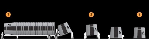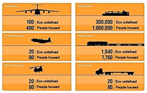 Sa ovom realnošću na umu, Reaction Housing System je razvijen. Jedan teretni brod može da isporuči čak 300.000 "Exo" baznih stambenih jedinica koje su sposobne da pruže utočište za preko milion izbeglica. Grafikon ispod pokazuje isporuku i instalaciju Exo stambenih jedinica kamionom. Kamion može da transportuje oko 20 Exo jedinica.