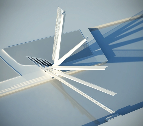 Rotirajući pokret pet prefabrikovanih čeličnih greda je raspoređen tako da one počnu da se kreću istovremeno zaustavljajući se u isto vreme u uspravnom položaju pod različitim uglovima između 20 i 80 stepeni.