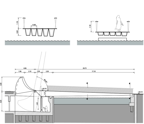 Opterećenje hidraulike je ublaženo upotrebom protivtegova, koji takođe smanjuju potrebnu energiju za rad. Balustrade su napravljene od šipki od nerđajućeg čelika koje se prepliću u iskrivljenom obrascu, stvarajući filigransku strukturu. Kontinuirano LED osvetljenje je integrisano u rukohvatima, osvetljavajući adekvatno pešači most i dramatično naglašavajući balustradu.