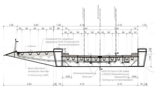 Tehnički preduslovi predstavljali su arhitektama i inženjerima veliki izazov, pošto zemljište oko pruge koje mora biti premošćeno nudi samo malo prostora za gradilište i teško mu je pristupiti sa građevinskom opremom. Most mora biti izgrađen dok se železničke linije odvijaju neometano i iz tog razloga će biti podignut uz pomoć uzdužnog produženja.