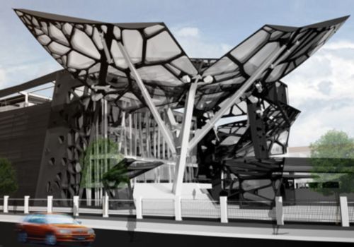 Komplikovani šablon na fasadi je prvobitno inspirisan krilima leptira ili šarama konjica. Da bi se postigla sistematska i organska priroda obrasca koji se nalaze na krilima ovih insekata, korišćene su parametarske alatke za generisanje i dizajn fasade. Materijal za omotač je od čelika i stakla. Obrazac daje svetlu ali čvrstu strukturu. Ona skriva i ugrade u hidrauliku koji se kreću i drže ga na mestu. Rezultat je prelep komplikovani šablon, koji omogućava da dnevna svetlost prodre u izložbenu salu i da proizilazi u kampus noću.