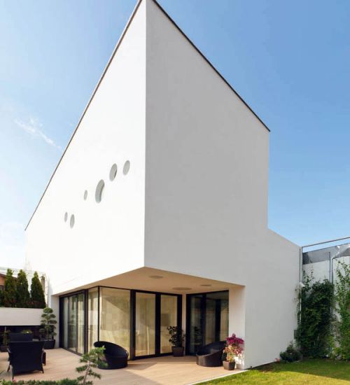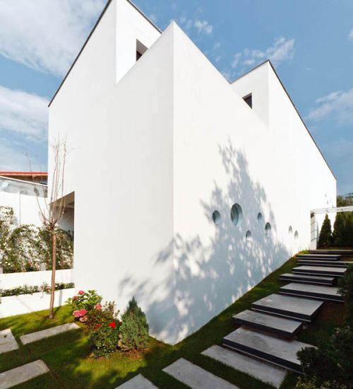 Rumunski arhitektonski biro TECON je uočio priliku da stvori "privatnost koja zadovoljava javnost" rezidenciju, gde su mesta podeljena na prednjoj strani dvorišta. Pristup preko elegantne zbirke asimetričnih koraka, ugrađene na blago nagnutom terenu zaobljenih prozora dovodi do čiste bele fasade, unutrašnjost se izlaže svetlu a aranžman dobrodošlice fokusira se na ideji transparentnosti.