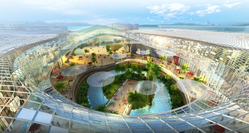 Ovaj koncept u obliku cveta Hainting bej se proteže nad celim projektom, uokvirujući dva odvojena maloprodajna objekta u organsku staklenu celinu sa talasastim krovom koji je formiran od stakla i aluminijumskih panela. U centru se nalazi veliki ulazni deo koji nadsvođuje 50 metara prostora koji je podržan sa nizom čeličnih lukova visokih 35 metara.
