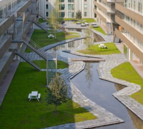 Bašta je okružena četiri sprata stambenim blokom koji sadrži 168 apartmana. Strana koja bude okrenuta prema Karspeldref- u štitiće vrt od ulične buke i stvoriće urbani zid. Struktura čini projekat pristupačnim. Velike terase kreiraju dinamične obrasce.