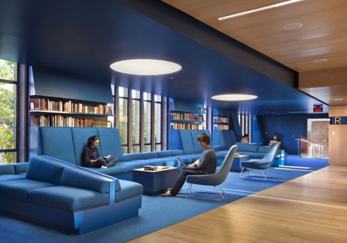 S druge strane, tapacirani banket definiše susedni dnevni boravak studija. Studenti se mogu lako prebaciti između obe zone i njihove potrebe se menjaju tokom dana, omogućavajući im da rade pojedinačno ili zajednički u dvadesetčetvoročasovnom ožičenom okruženju.